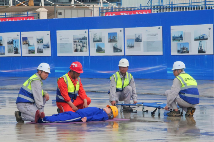 此次應(yīng)急演練模擬在延化化工公司6080項(xiàng)目尿素主框架施工現(xiàn)場,一名作業(yè)人員在高處作業(yè)過程中,因腳手架踏板未固定,安全帶系掛不牢,不慎從三層作業(yè)處墜落受傷。安全員發(fā)現(xiàn)險(xiǎn)情后,迅速啟動應(yīng)急救援預(yù)案,由現(xiàn)場30余人組成的通訊聯(lián)絡(luò)、搶險(xiǎn)救援、醫(yī)療救護(hù)、技術(shù)調(diào)查、警戒保衛(wèi)、物資支持等六個(gè)小組分工合作,及時(shí)搶救傷員并對墜落區(qū)域進(jìn)行疏散隔離,整個(gè)演練過程井然有序,突發(fā)事故得到了妥善處理。