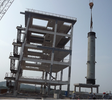 第一臺(tái)重達(dá)14噸的石墨換熱器,吊裝半徑40米且需要穿過樓層的預(yù)留孔洞完成吊裝,一陣“悅耳”的鞭炮聲拉開了興發(fā)PPA第一吊的帷幕。在起重班長的指揮下,200噸履帶吊、25噸汽車吊,一套起鉤、溜尾、起吊、下鉤、就位行云流水般動(dòng)作,各個(gè)專業(yè)的技術(shù)人員默契的配合,規(guī)范的安全警戒防護(hù)、細(xì)膩的成品保護(hù)細(xì)節(jié)讓現(xiàn)場(chǎng)的業(yè)主、總承包、監(jiān)理均交口贊譽(yù)。15日的吊裝工作持續(xù)到晚上19點(diǎn)30分,整個(gè)PPA場(chǎng)地里萃取框架在夕陽的余暉中是那么的惹眼,雪白的框架在一片灰色中傲然獨(dú)立,框架上的中化四建是如此的奪目!