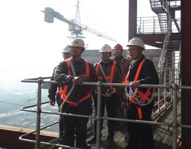 由于此次設(shè)備工程分公司承接的寧夏大地循環(huán)發(fā)展股份有限公司天瑞發(fā)電公司4×480t/h型高溫、高壓、循環(huán)流化床鍋爐安裝工程,為公司首次承接的最大型鍋爐安裝項目,因此倍受公司關(guān)注。14日,胡流芳一行到項目現(xiàn)場后,立即系上安全帶,登上54米高的鍋爐安裝平臺,一層一層的仔細(xì)查看安裝施工細(xì)節(jié),詳細(xì)了解質(zhì)量過程控制措施,認(rèn)真檢查各部位的安全防護情況。與此同時,張娣玲對項目部工程施工質(zhì)量過程控制資料、安全資料等進行了認(rèn)真檢查,并在項目部安全工作例會上對360多名參建員工就施工安全注意事項進行了重點強調(diào)。