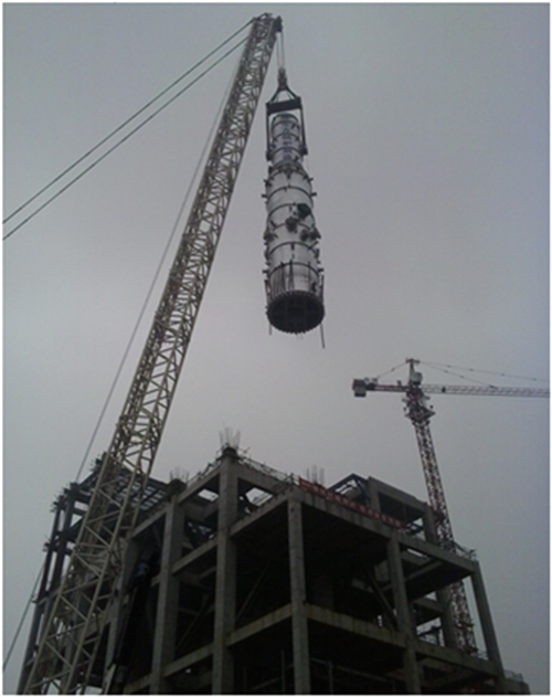 該裝置采用投煤量為3000噸/天的SHELL氣化爐,設(shè)備直徑為φ4750/3350×35322,重483噸,是目前世界上最重的氣化爐,安裝在氣化框架42米高的混凝土樓面上。此次吊裝使用CC8800-1 型 1600噸履帶吊作為主吊車,400噸履帶吊進(jìn)行溜尾,一次成功將氣化爐吊裝就位。