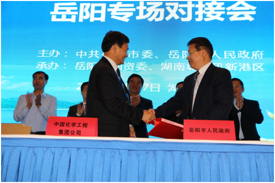 余津勃代表中國化學工程集團公司,作為第一個央企代表與岳陽市委常委、市政府常務副市長唐道明簽訂岳陽市人民政府—中國化學工程集團公司戰(zhàn)略合作框架協(xié)議。協(xié)議內(nèi)容為:岳陽市人民政府支持中國化學集團公司在岳陽市范圍內(nèi)依法合規(guī)開展化學工程項目建設、?;芫W(wǎng)改造、城市地下管網(wǎng)建設、化工管道安裝和其他市政、環(huán)保、工業(yè)廢棄場地處理等項目建設,并在項目前期調(diào)研、項目實施提供支持并營造好的環(huán)境,協(xié)調(diào)在岳項目地履行合同辦理所涉及各項行政審批義務。中國化學集團公司協(xié)調(diào)所屬工程公司、基金公司、財務公司在岳陽市區(qū)域內(nèi)完成項目投資和投融資支持。2016年首批啟動“四化建商業(yè)綜合體建設工程”等項目。