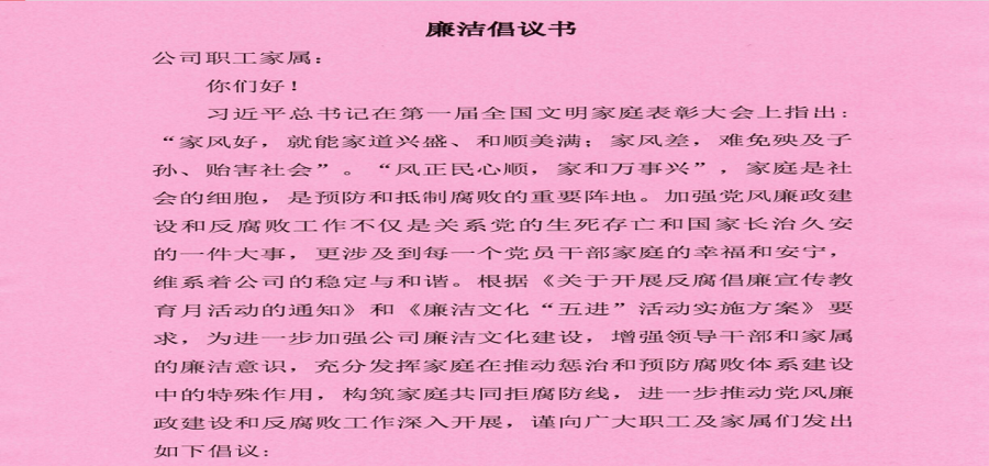 為進一步加強公司廉潔文化建設,增強領導干部和家屬的廉潔意識,充分發(fā)揮家庭在推動懲治和預防腐敗體系建設中的特殊作用,構(gòu)筑家庭共同拒腐防線,進一步推動黨風廉政建設和反腐敗工作深入開展,近日,公司紀委在全公司范圍內(nèi)開展“清廉家風倡議”活動。