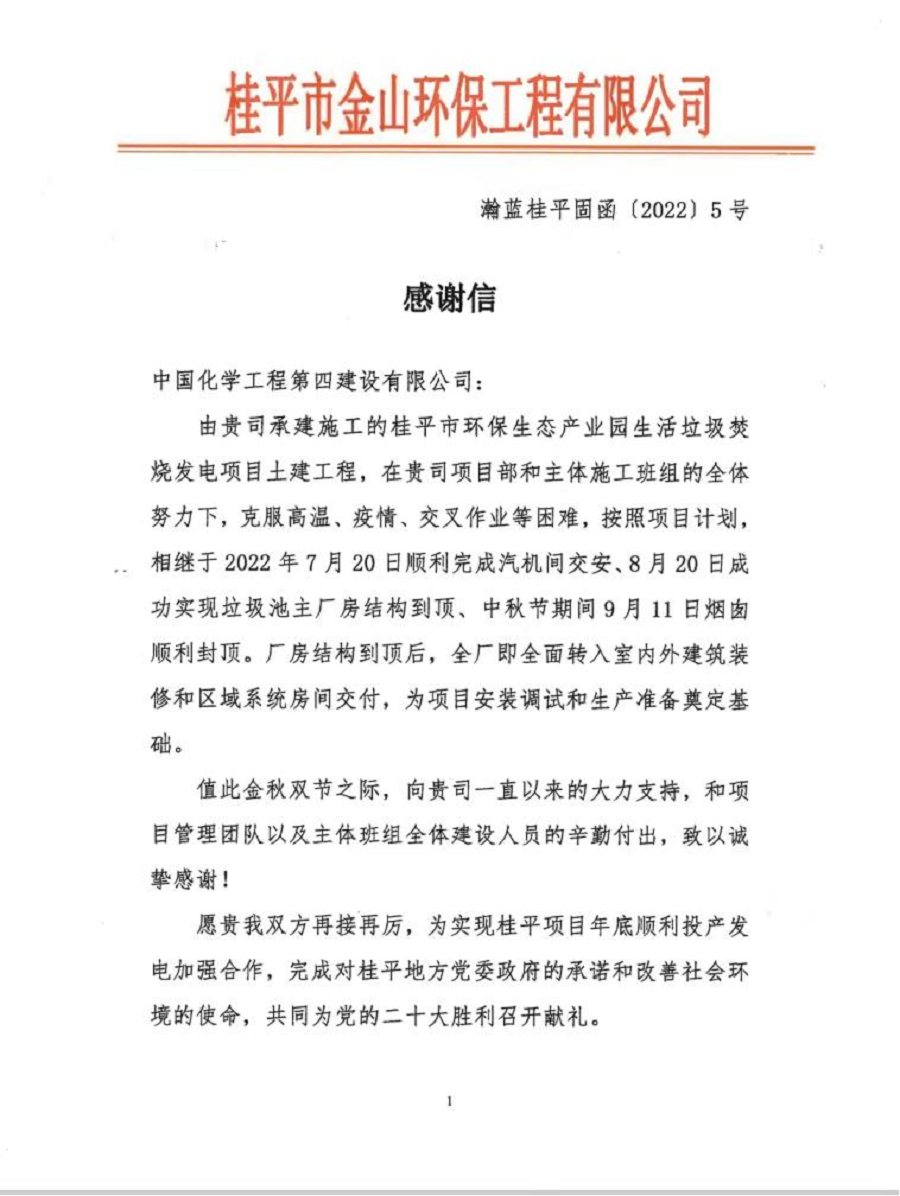近日,由華南公司承建的桂平垃圾焚燒發(fā)電項目收到業(yè)主桂平市金山環(huán)保工程有限公司的感謝信,感謝公司的大力支持和項目團隊、主體班組全體建設人員的辛勤付出。