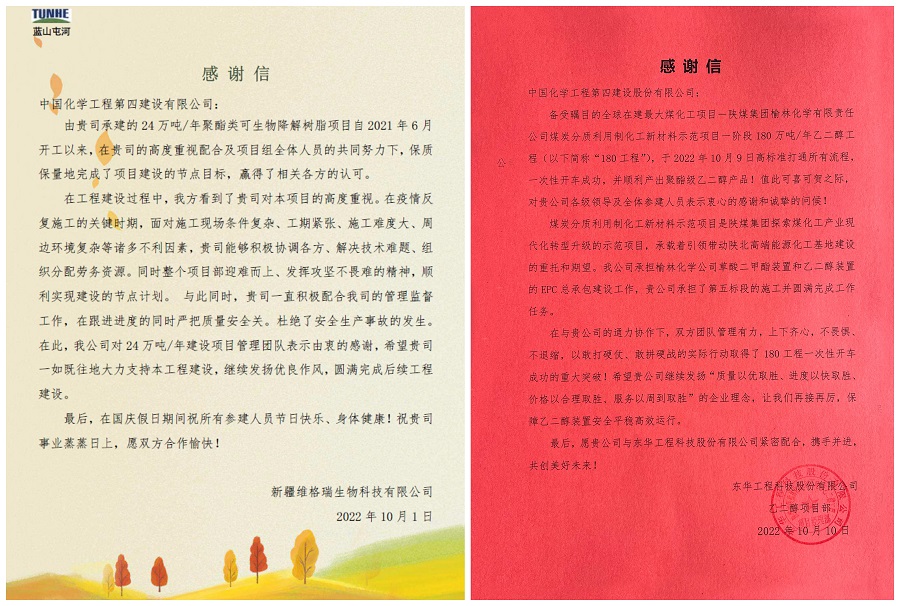 近日,新疆藍山集團維格瑞生物科技有限公司、東華工程科技有限公司和天津渤化永利化工有限公司等多家業(yè)主向公司發(fā)來感謝信,感謝公司優(yōu)質高效的施工和良好的服務。