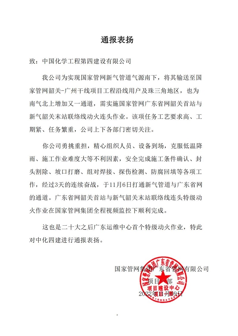 東北公司國(guó)家管網(wǎng)韶關(guān)-廣州干線項(xiàng)目收到業(yè)主表?yè)P(yáng)信