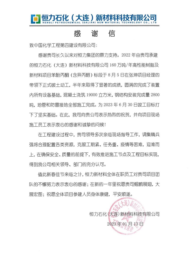 近日,東北公司收到恒力石化(大連)新材料科技有限公司發(fā)來的感謝信,對東北公司承建的苯酚丙酮裝置工作給予高度肯定,并對項目現(xiàn)場施工員工的辛勤付出表示感謝。