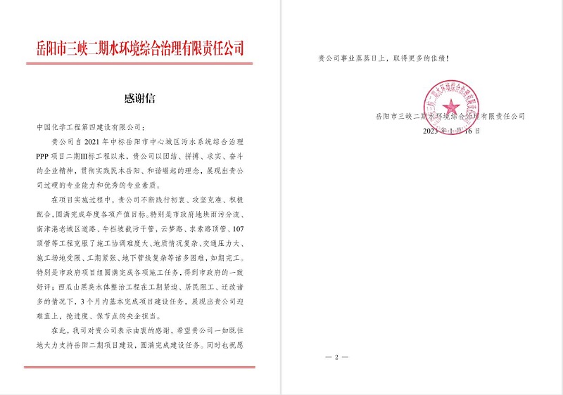 1月16日,岳陽市中心城區(qū)污水系統(tǒng)綜合治理項目部收到岳陽市三峽二期水環(huán)境綜合治理有限責任公司發(fā)來的感謝信。