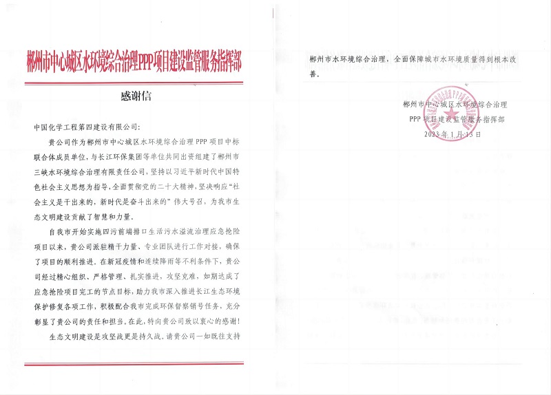 新年伊始,公司郴州項目部收到郴州市中心城區(qū)水環(huán)境綜合治理PPP項目建設(shè)監(jiān)管服務(wù)指揮部發(fā)來感謝信。