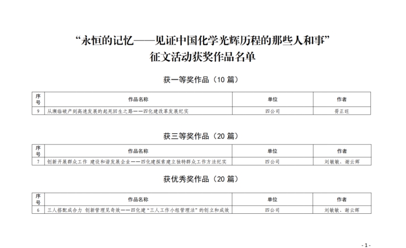 2020年3月以來,集團(tuán)公司組織開展了“永恒的記憶——見證中國化學(xué)光輝歷程的那些人和事”征文活動。該活動得到了公司職工的積極響應(yīng),共向集團(tuán)上報8篇征文作品。其中由公司工會主席胥正旺撰寫的征文《從瀕臨破產(chǎn)到高速發(fā)展的起死回生之路——四化建改革發(fā)展紀(jì)實》榮獲一等獎,由公司黨群工作部主任劉敏敏、《四化建簡報》執(zhí)行主編謝云輝共同撰寫的征文《創(chuàng)新開展群眾工作 建設(shè)和諧發(fā)展企業(yè)——四化建探索建立獨特群眾工作方法紀(jì)實》《三人搭配成合力 創(chuàng)新管理見奇效——四化建“三人工作小組管理法”的創(chuàng)立和成效》分別榮獲三等獎和優(yōu)秀獎,并先后在中國化學(xué)微信公眾號和《中國化學(xué)報》刊登。