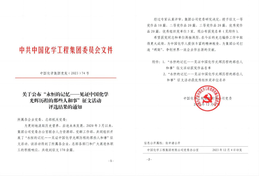 12月4日,中國化學(xué)工程集團(tuán)有限公司發(fā)文公布“永恒的記憶——見證中國化學(xué)光輝歷程的那些人和事”征文活動評選結(jié)果,公司三篇作品分別榮獲一等獎、三等獎和優(yōu)秀獎。