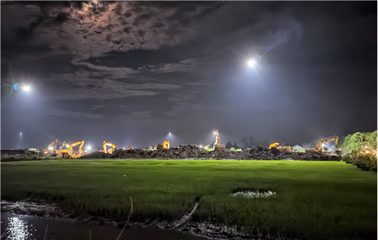 因第三道防線地處岳陽市君山區(qū)良心堡鎮(zhèn)一個小村落,基礎設施極不完善,施工面臨村內(nèi)稻田、水塘、溝渠縱橫,高壓線、照明線架設高度不夠,搶建期間社會車輛、搶險車輛密集通行,土方石方須遠距離運輸?shù)痊F(xiàn)實困難,公司不等不靠,多方協(xié)調、創(chuàng)新方法,有效克服了大型機械進場難、場內(nèi)交通組織難、土方石方調配難、安全管理執(zhí)行難等難以想象的困難,比預期提前8個小時實現(xiàn)堤壩合龍。
