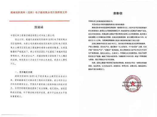 湖南雙陽高科(岳陽)電子級雙氧水項目指揮部在致謝函中表示,在雙氧水項目建設(shè)期間,面對高溫酷暑的嚴(yán)峻挑戰(zhàn),市政公司項目團(tuán)隊展現(xiàn)出卓越的項目管理能力,在安全生產(chǎn)、質(zhì)量控制、進(jìn)度管理等方面贏得了相關(guān)各方的廣泛認(rèn)可,為項目順利推進(jìn)作出了突出貢獻(xiàn),謹(jǐn)向公司和項目部全體人員表示衷心感謝。