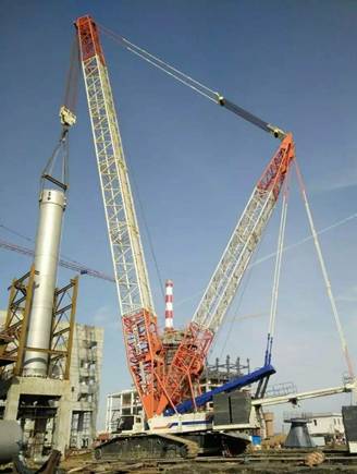 4日上午9時(shí)30分,470噸氨合成塔在800噸履帶吊主吊與130噸、180噸兩臺(tái)汽車吊抬尾的配合下緩緩吊起,下午3時(shí)整,穩(wěn)穩(wěn)就位在預(yù)定的位置,圓滿完成了吊裝任務(wù)。