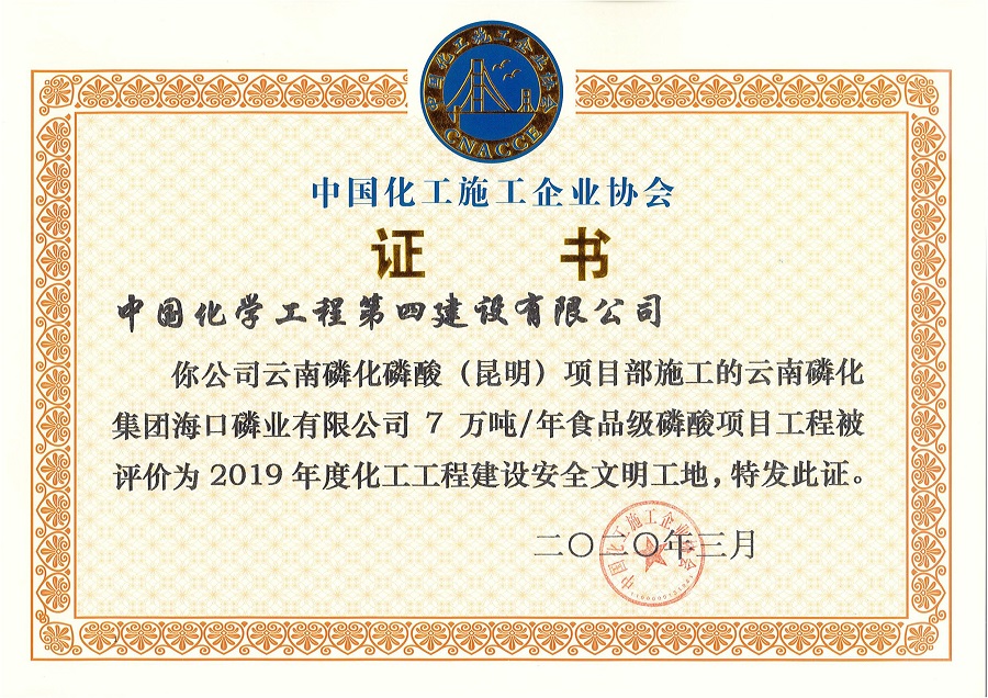 5月21日,西南分公司收到中國(guó)化工施工企業(yè)協(xié)會(huì)頒發(fā)的云南磷化??诹讟I(yè)有限公司7萬(wàn)噸/年食品級(jí)磷酸項(xiàng)目“2019年度化工工程建設(shè)安全文明工地”證書。