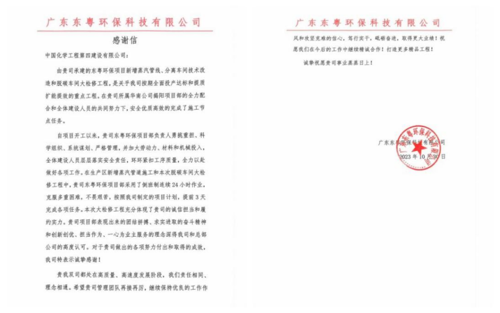 近日,華南公司收到廣東東粵環(huán)??萍加邢薰景l(fā)來感謝信,對項(xiàng)目部提前3天完成新增蒸汽管線、分離車間技術(shù)改造和脫碳車間大檢修工程表示誠摯感謝。