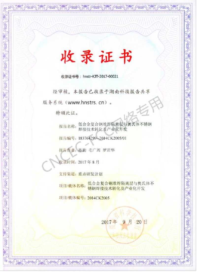 科技成果報告收錄證書:低合金復(fù)合鋼堆焊隔離層與奧氏體不銹鋼焊接技術(shù)轉(zhuǎn)化及產(chǎn)業(yè)化開發(fā)