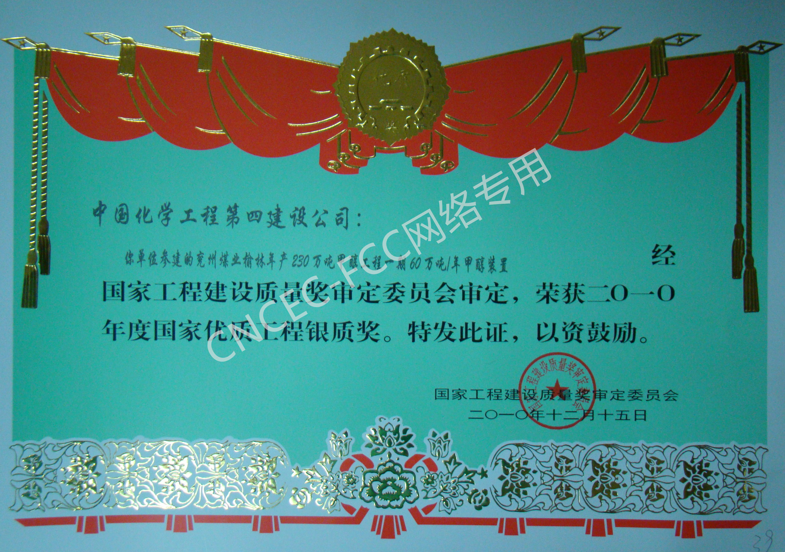 兗州煤業(yè)榆林年產(chǎn)230萬噸甲醇工程一期60萬噸年甲醇裝置國(guó)家優(yōu)質(zhì)工程銀質(zhì)獎(jiǎng)